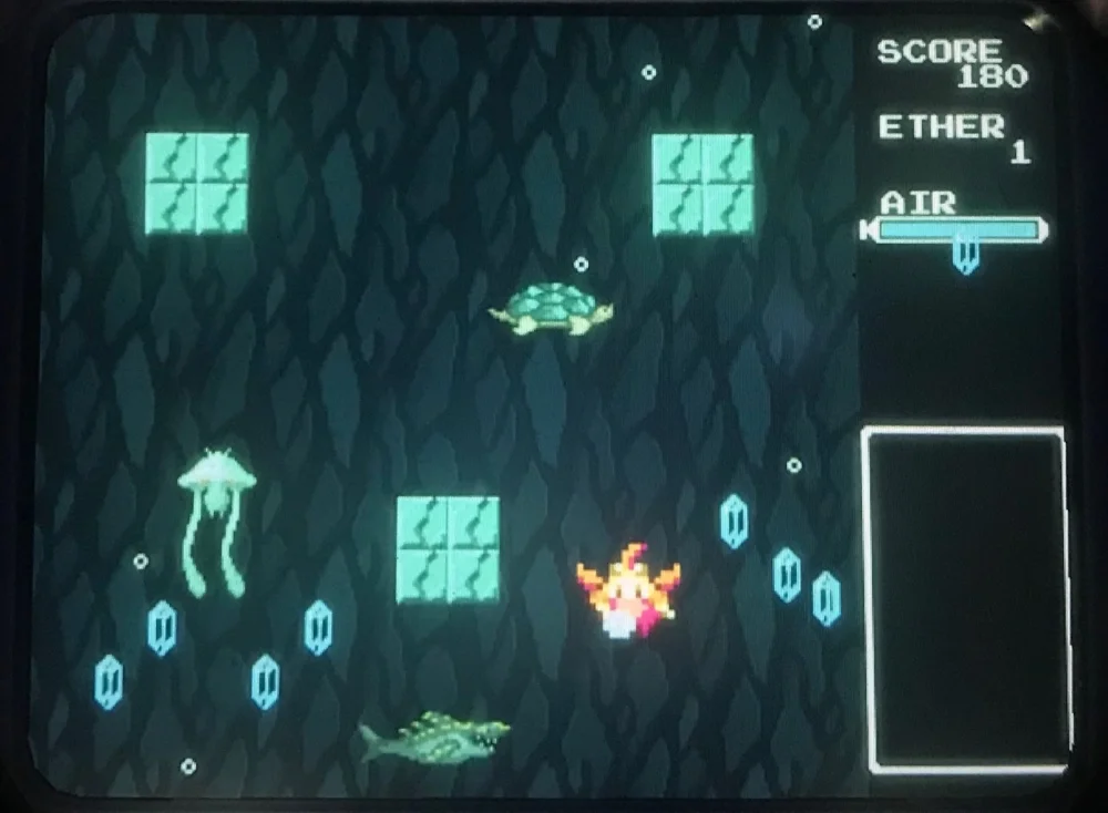 The gameplay for Tiger! Tiger! is simple. Your little on screen character dives to try and get treasure. Problem is you lose Air if you hit any enemies (usually underwater sharks, jellyfish, etc.) and hit any of the blocks. On Easy difficulty, players don’t have to worry about hitting any of the blocks.